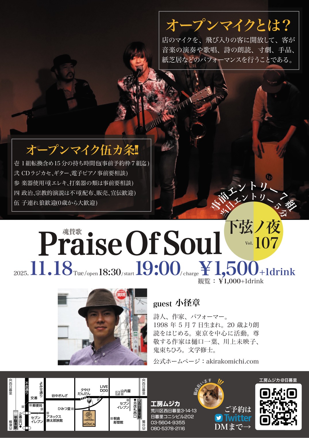 11月18日(火)に日暮里でおこなわれるオープンマイクイベント「Praise Of Soul」にゲスト出演します。
