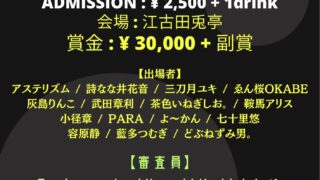 おしらせ 「果詩合 其の六」に出場します ハルタダイチさんが主催する自作詩朗読の競技会「果詩合 其の六」(はたしあい・そのろく)に出場します。とき:2025年11月29日(土) 12:30開場、13:00開演ところ:兎亭(江古田)料金:2500円+1ドリンク3分間の詩を読み、審査員... 2025.09.19 おしらせ